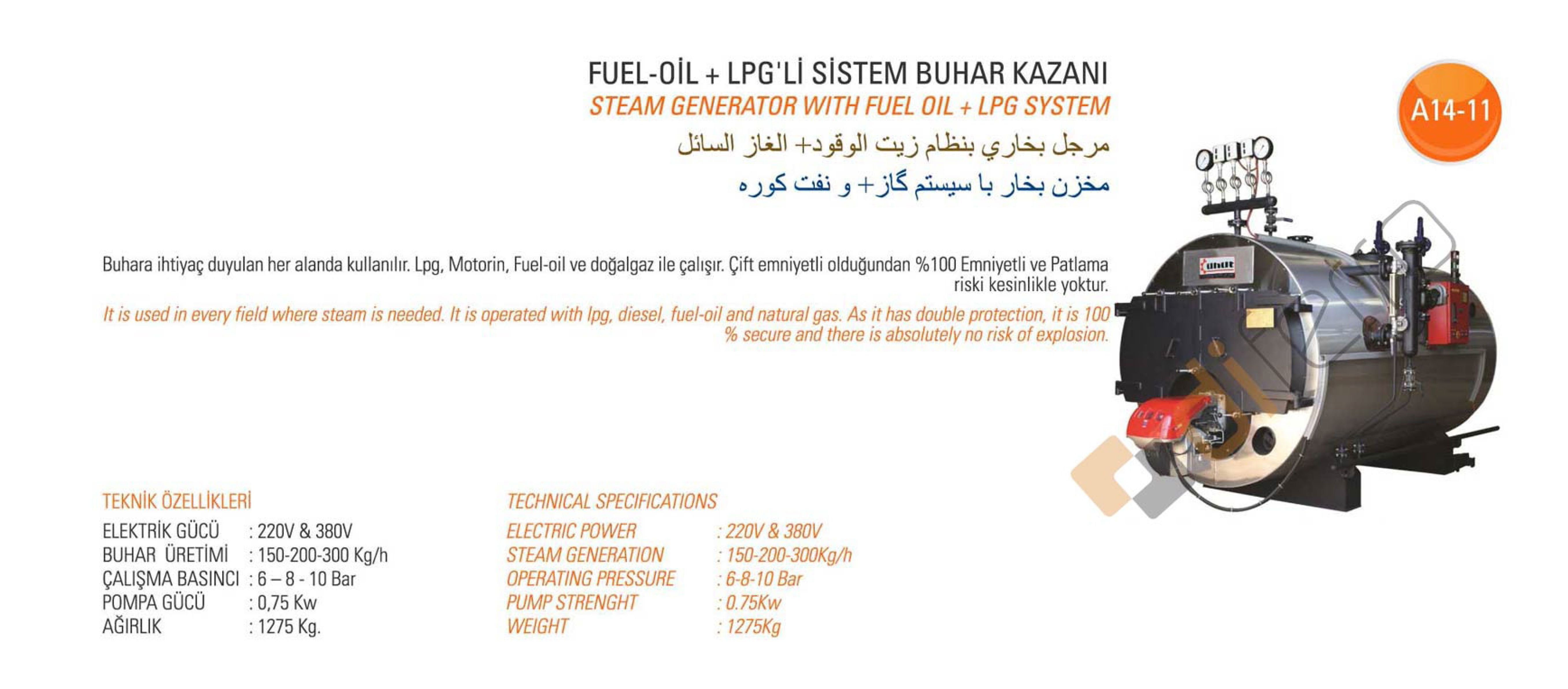Buhara ihtiyaç duyulan her alanda kullanılır. Lpg, Motorin, Fuel-oil ve doğalgaz ile çalışır. Çift emniyetli olduğundan %100 emniyetli ve patlama riski kesinlikle yoktur.