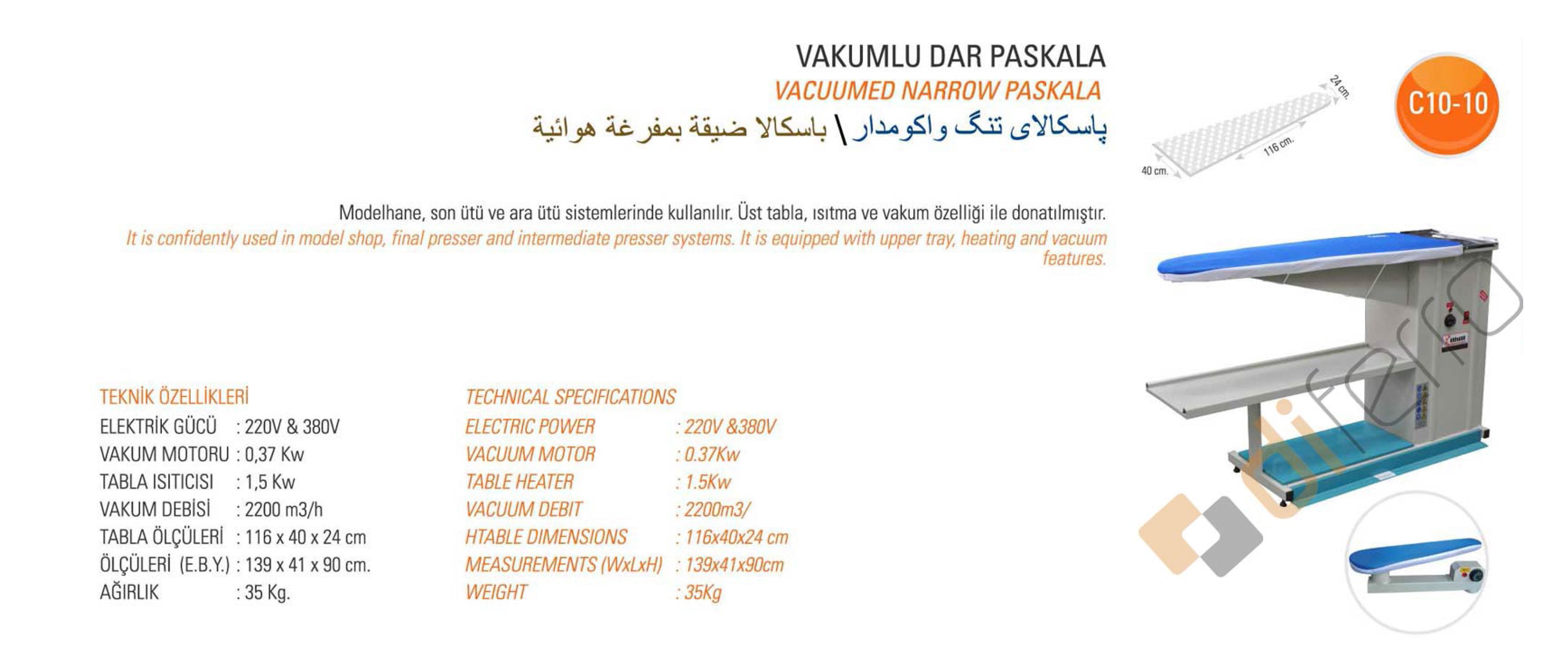 Modelhane, son ütü ve ara ütü sistemlerinde kullanıllır. Üst tabla, ısıtma ve vakum özelliğiyle donatılmıştır.