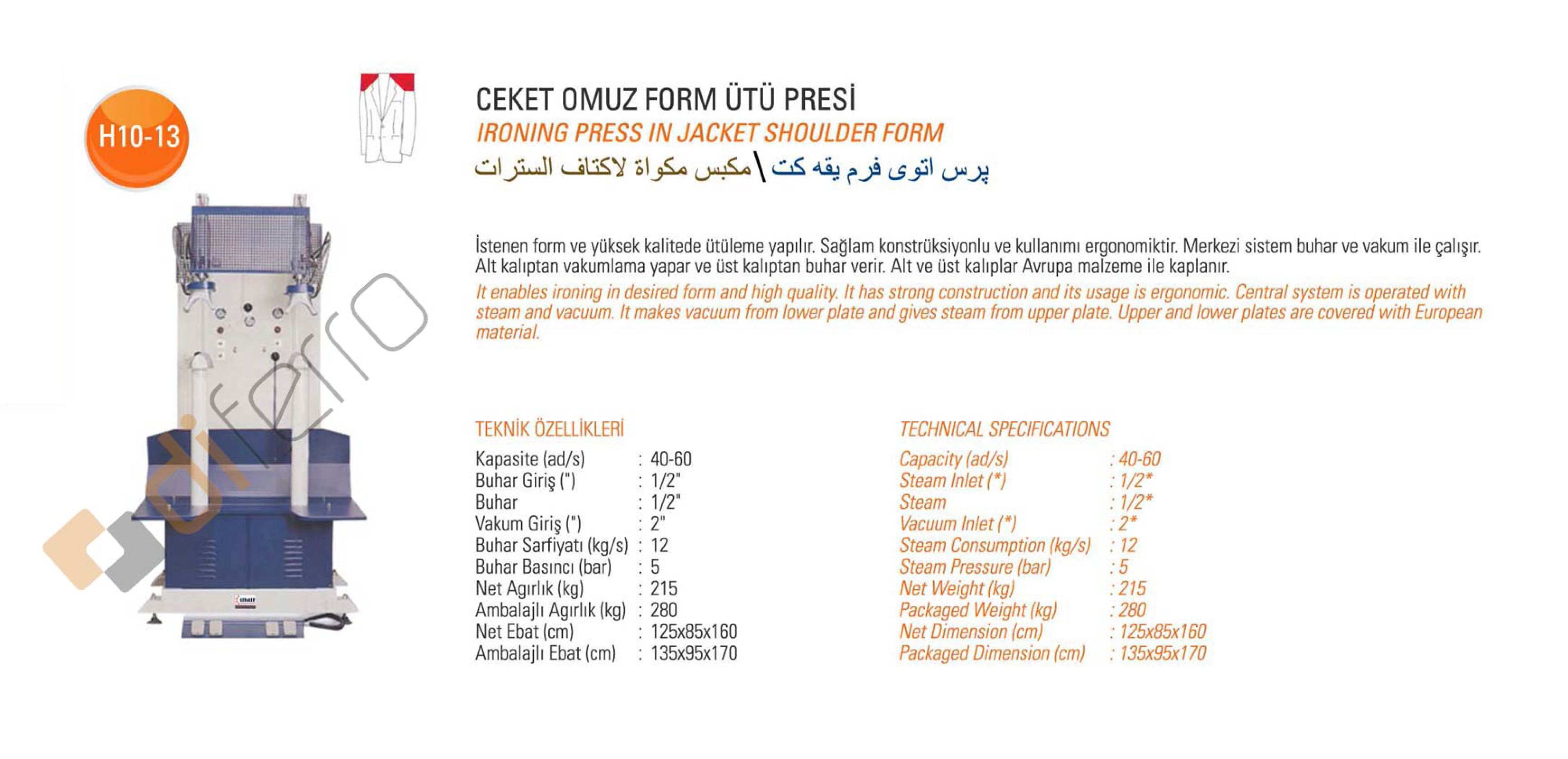 İstenen form ve yüksek kalitede ütüleme yapılır. Sağlam konstrüksiyonlu ve kullanımı ergonomiktir. Merkezi sistem buhar ve vakum ile çalışır. Alt kalıptan vakumlama yapar ve üst kalıptan buhar verir. Alt ve üst kalıplar Avrupa malzeme ile kaplanır.