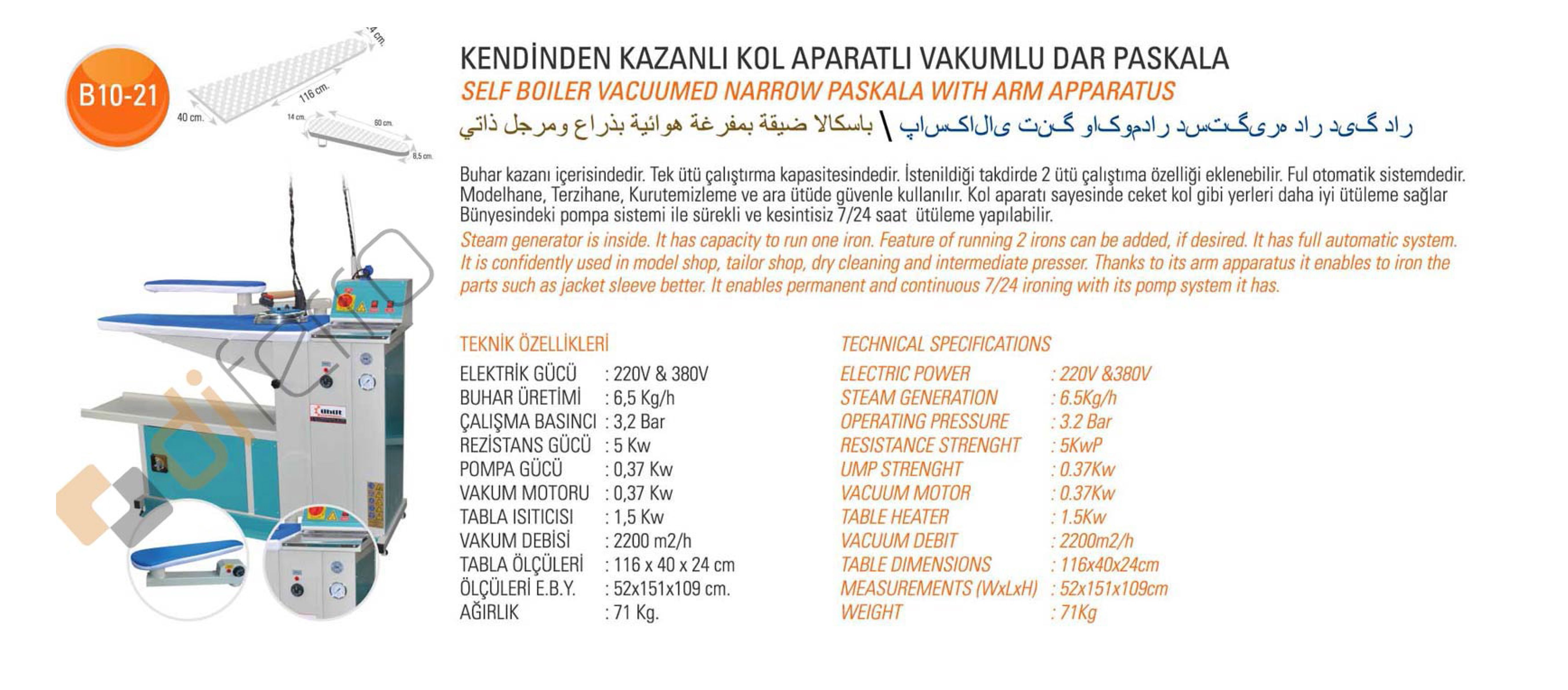 Buhar kazanı içerisindedir. Tek ütü çalıştırma kapasitesindedir. İstenildiği takdirde 2 ütü çalıştırma özelliği eklenebilir. Ful otomatik sistemdedir. Modelhane, Terzihane, Kurutemizleme ve ara ütüde güvenle kullanılır. Kol aparatı sayesinde ceket kol gibi yerleri daha iyi ütülenmesini sağlar. Bünyesindeki pompa sistemi ile sürekli ve kesintisiz 7/24 ütüleme yapılabilir.